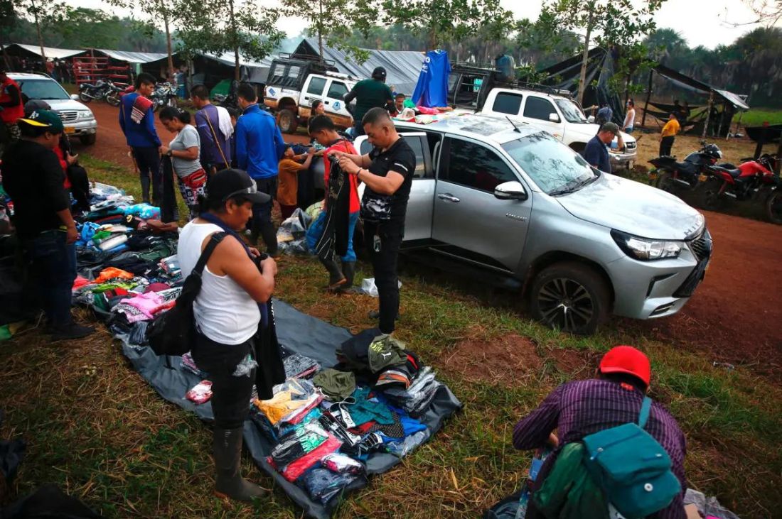 En carros y furgonetas convertidos en almacenes de ropa, alineados a ambos lados del camino principal, se podía encontrar desde camisetas de equipos de fútbol europeos hasta cobijas, pero también electrónica, como audífonos, o artículos del hogar, como cojines. Un pseudo centro comercial rodante vigilado por guerrilleros y sus fusiles.