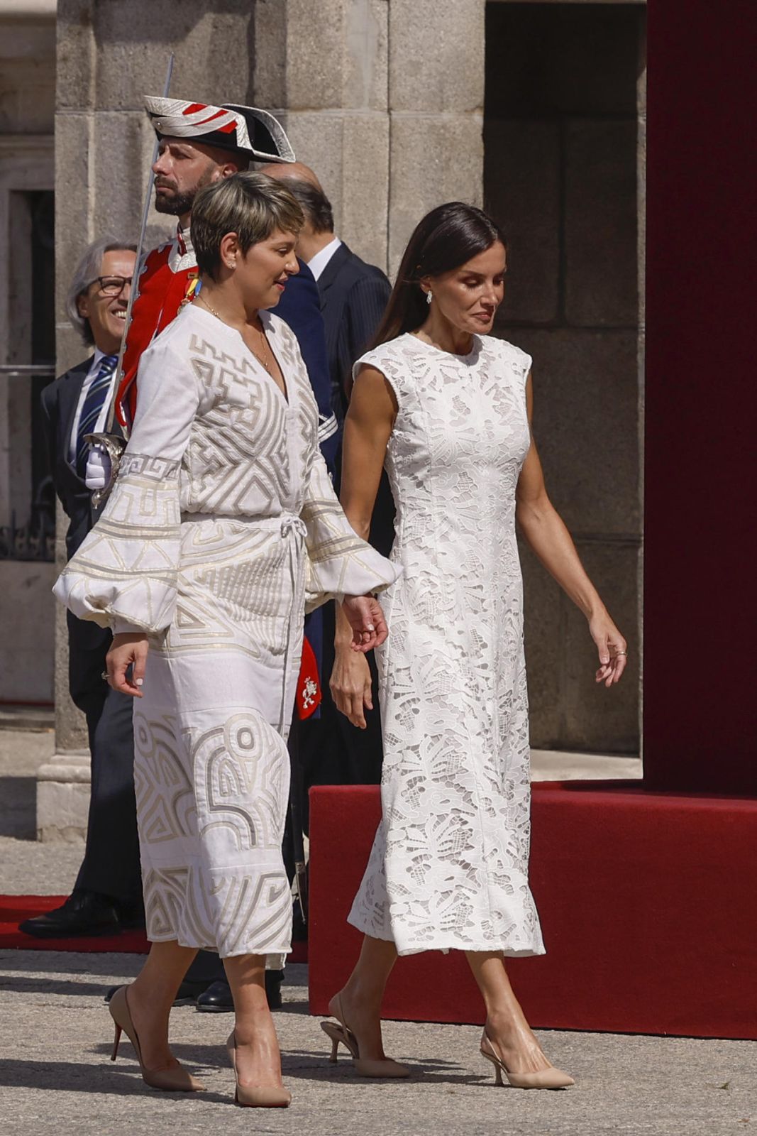 Para el recibimiento oficial, tanto Verónica Alcocer como la Reina Letizia eligieron el color blanco para sus vestidos, los dos de corte largo midi y con detalles de encaje. La Reina optó por un vestido que ya había usado en 2022 en un acto en la entrega de la bandera nacional a la fuerza de guerra naval especial. Un vestido blanco de encaje de 30 euros y de la marca Sfera. Por su parte, la primera dama, llevó un vestido blanco, con encaje y figuras geométricas del diseñador Andrés Otalora, y unos tacones color nude, al igual que la Reina.