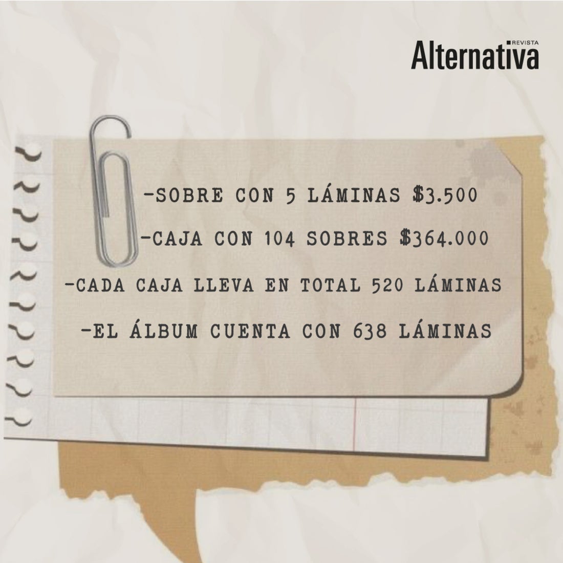 El álbum tiene un costo de $9.900 pasta blanda y tapa dura $34.900, el sobre con 5 láminas tiene un valor de $3.500, , la caja con 104 sobres cuesta $364.000 pesos y cada caja lleva en total 520 láminas.