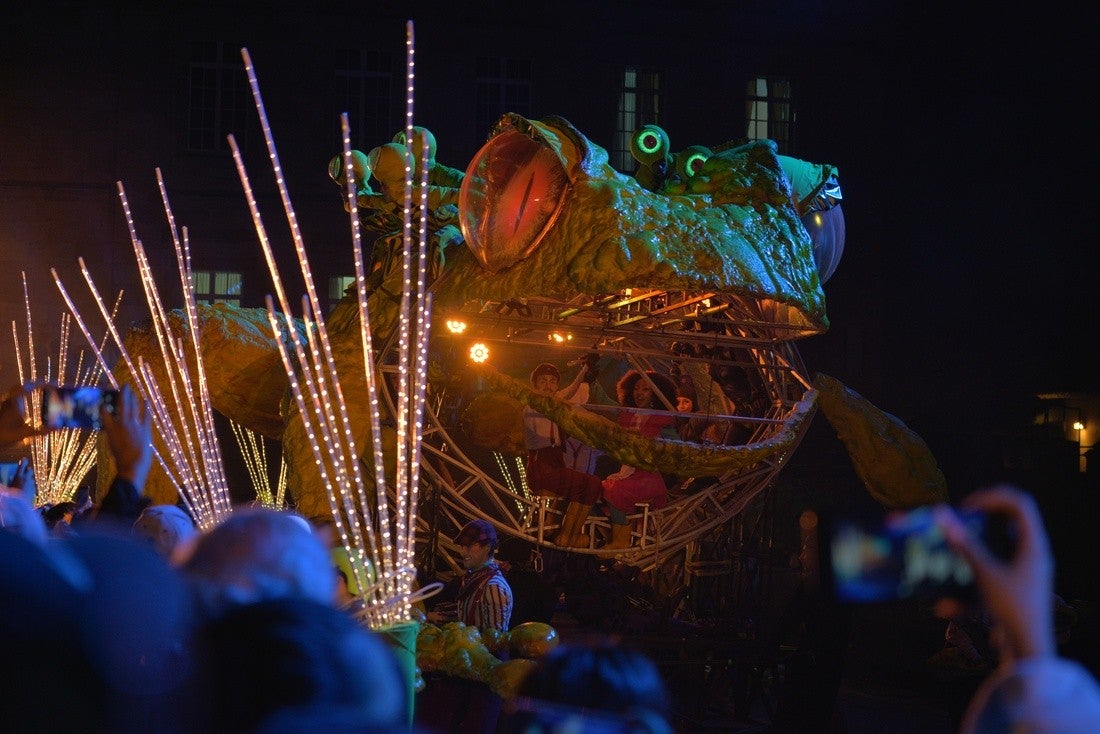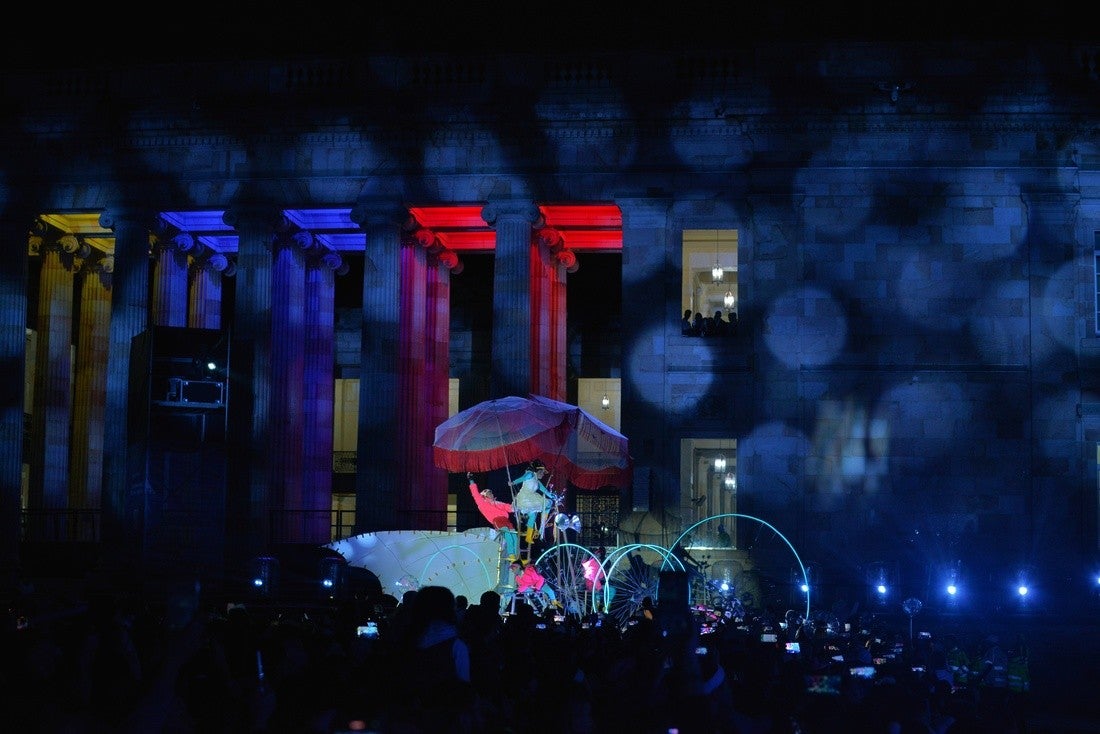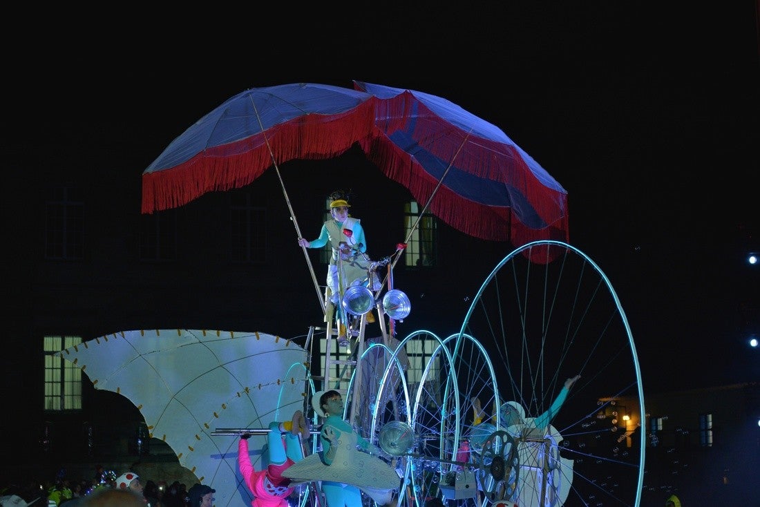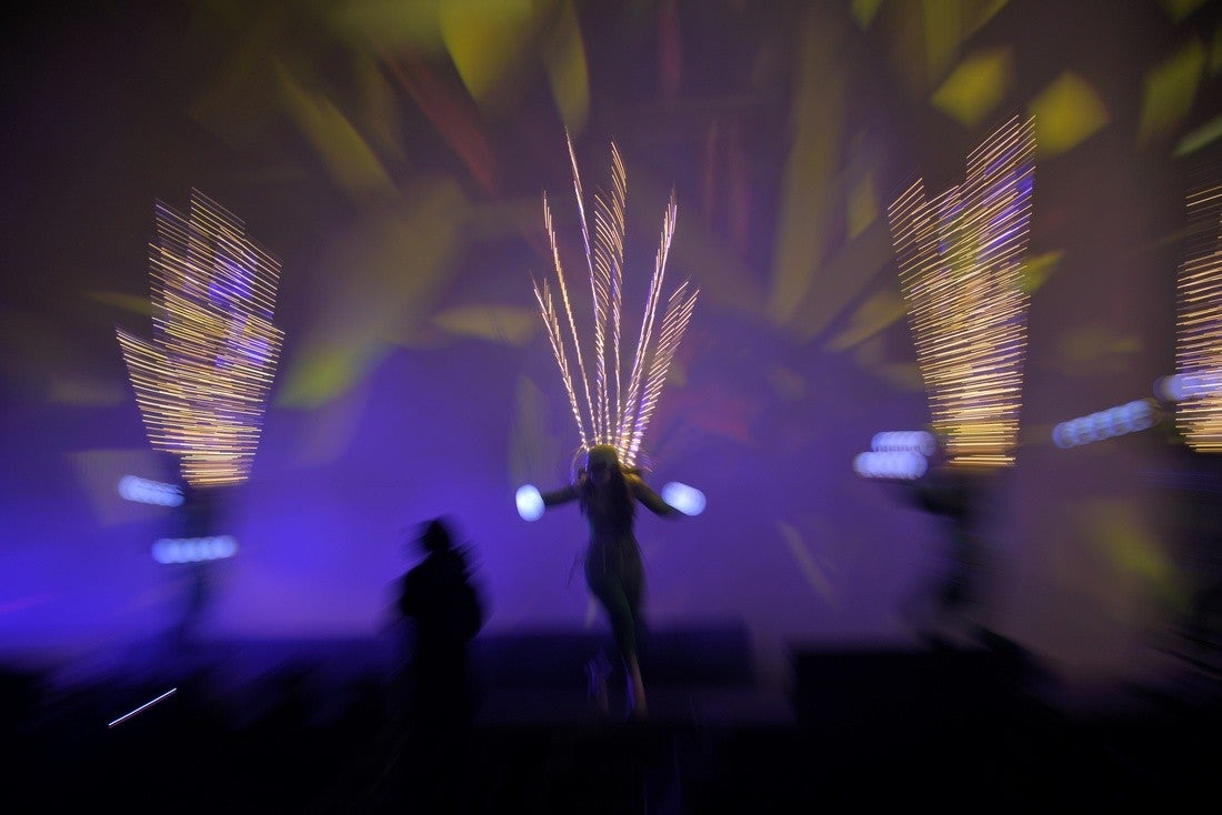 «El Árbol de la Abundancia», así ha sido bautizada esta impresionante puesta en escena con decenas de artistas, músicos y acróbatas dispuestos a entregar un mensaje de cuidado de la madre naturaleza, la relación del hombre y la tierra que da los frutos para sobrevivir, mensajes codificados en canciones y danza. Esta es una instalación de más de 70 mts. en donde asistimos a un delirante y colorido viaje sonoro y visual con proyecciones láser que se funden con los cuerpos de los artistas que realizan su performance sobre la tarima, los balcones o suspendidos en el aire por una grúa.