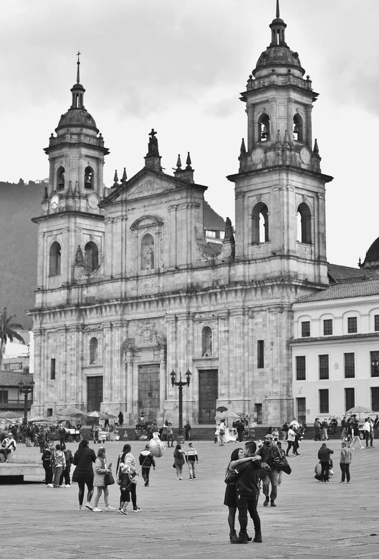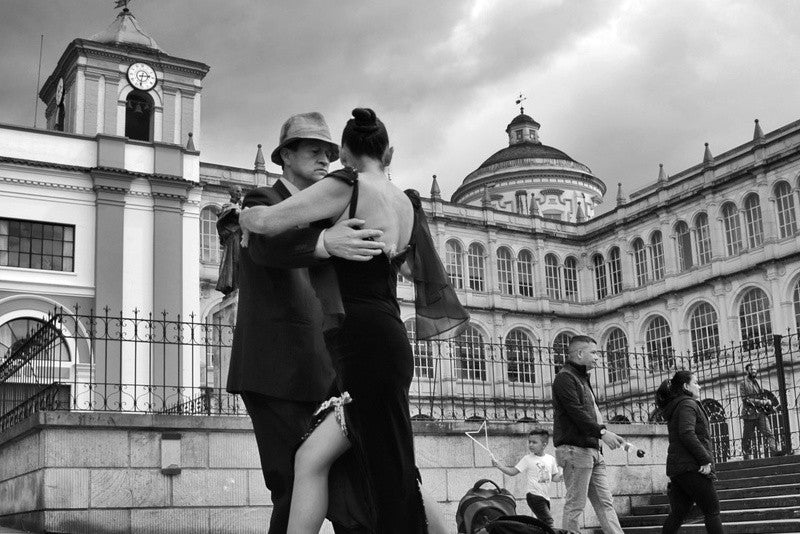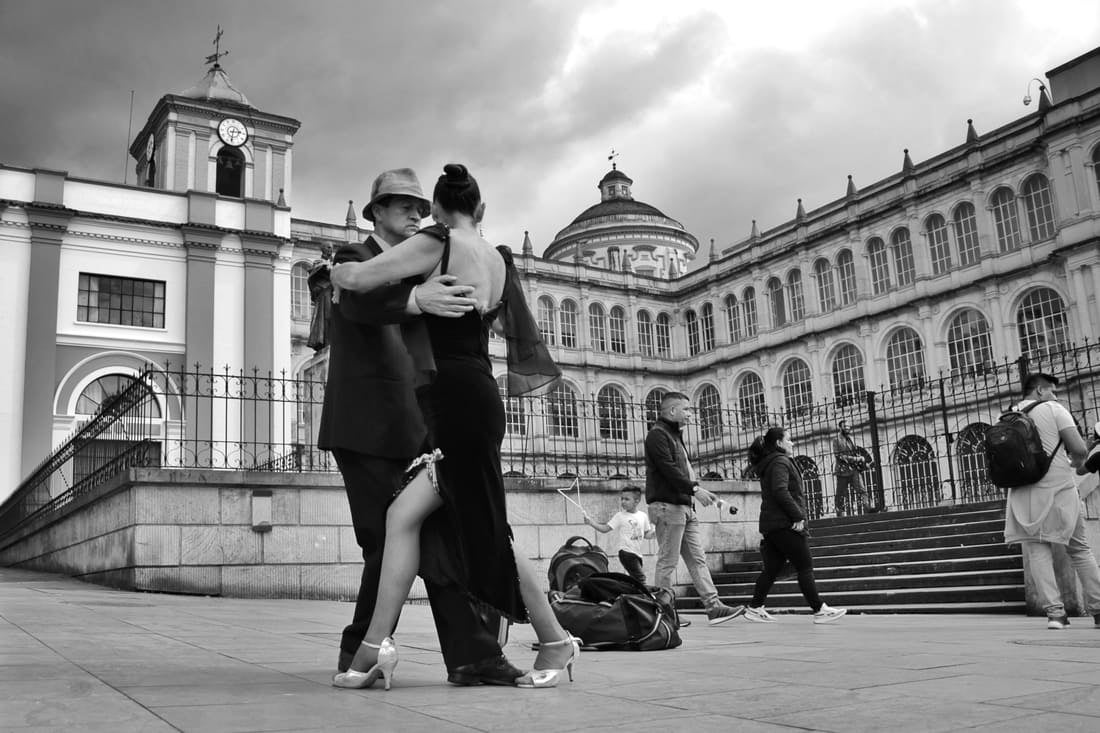 Bailarines callejeros de tango frente a la arquitectura del Colegio Mayor de San Bartolomé, fundado en 1604, el cual reposa a un costado del Congreso de la República en la Plaza de Bolívar