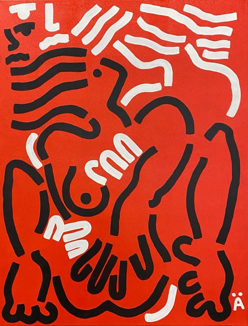 “Äm here es una declaración de intenciones y un juego de palabras con la a con diéresis que es mi firma. Una pintura que va de lo abstracto a lo figurativo y de lo figurativo a lo abstracto. Siempre utilizo trazos que son discontinuos y que invitan a la interpretación, y un poco, a que la persona que lo esté viendo baile con la imagen”, cuenta el artista.