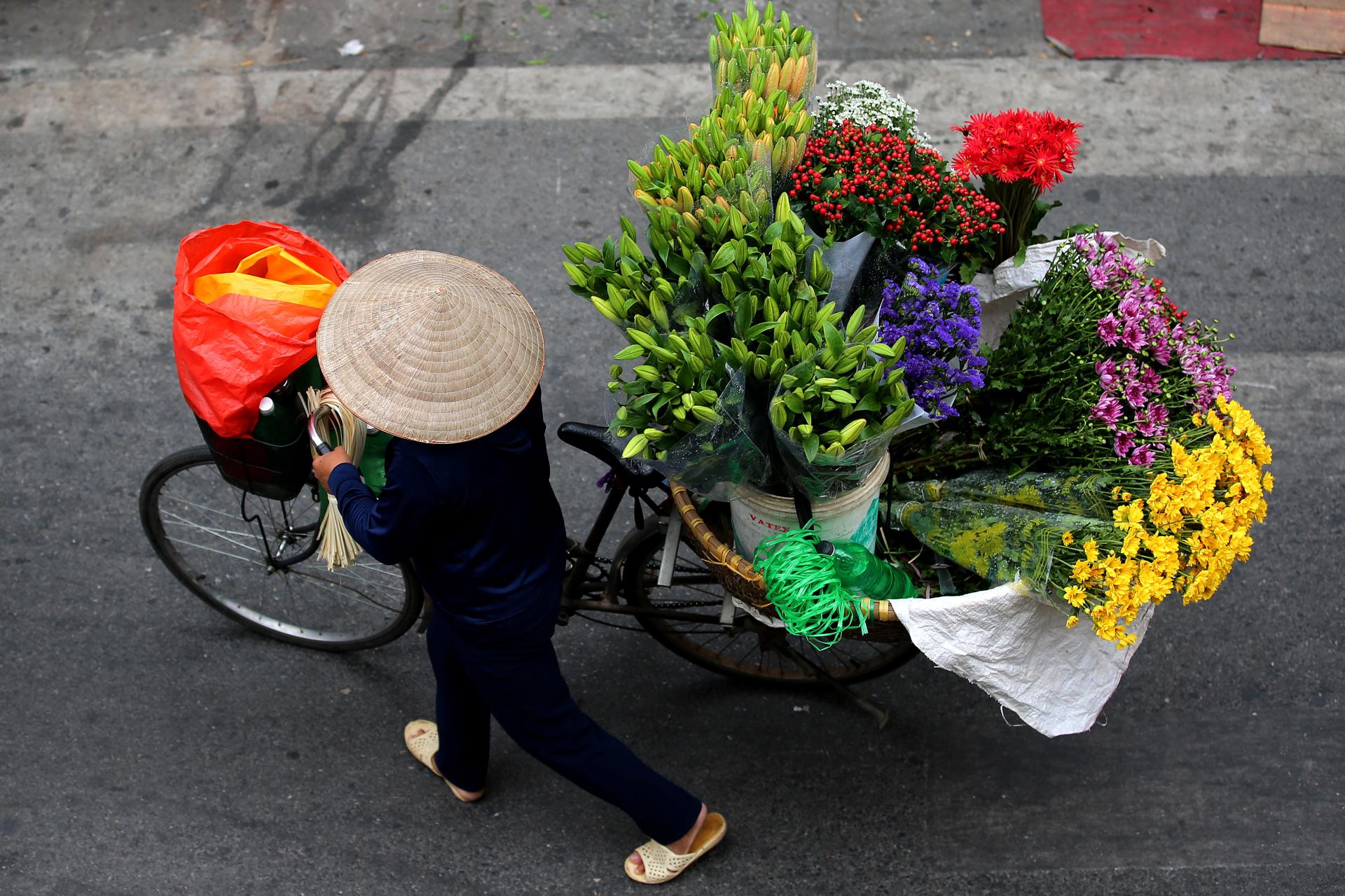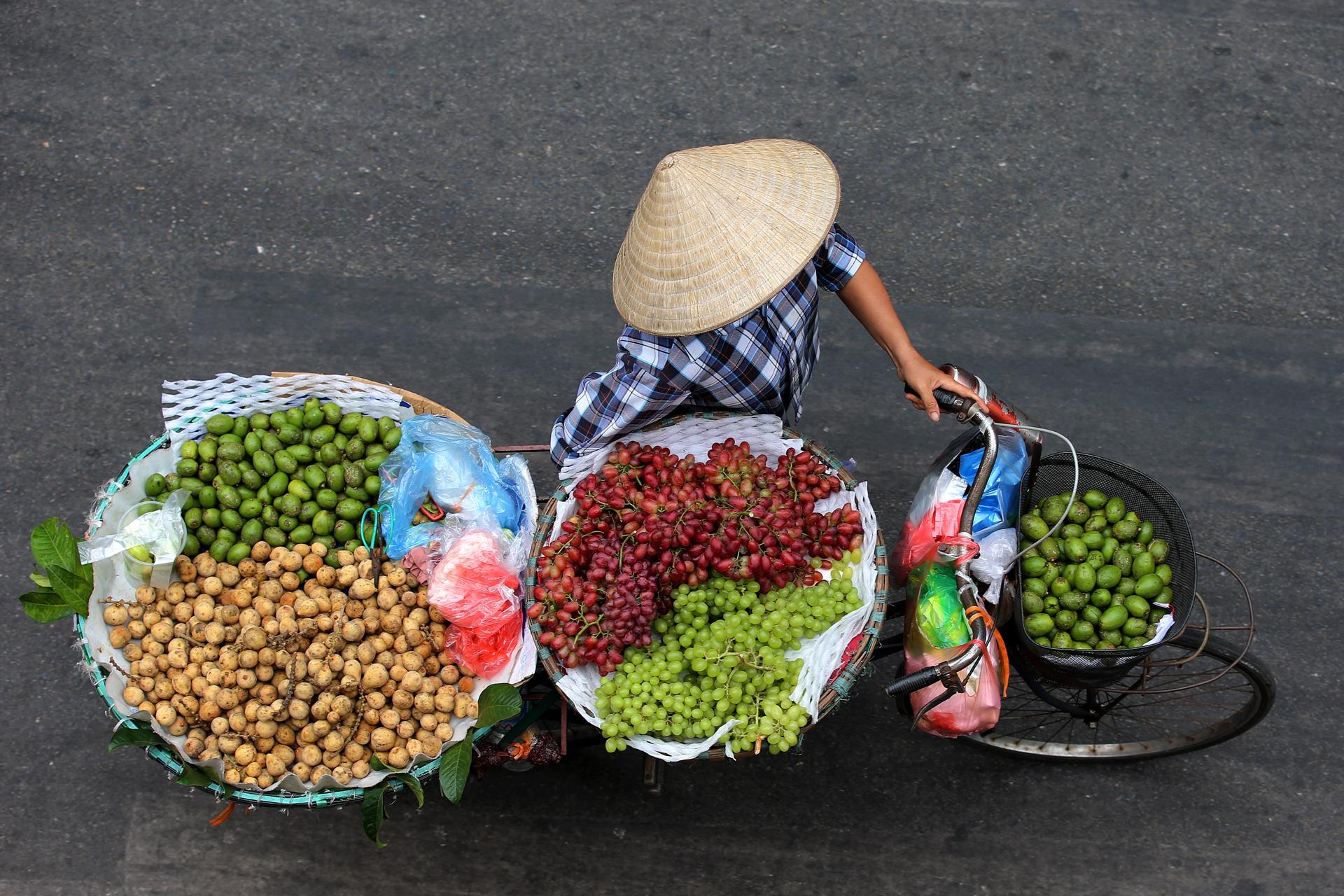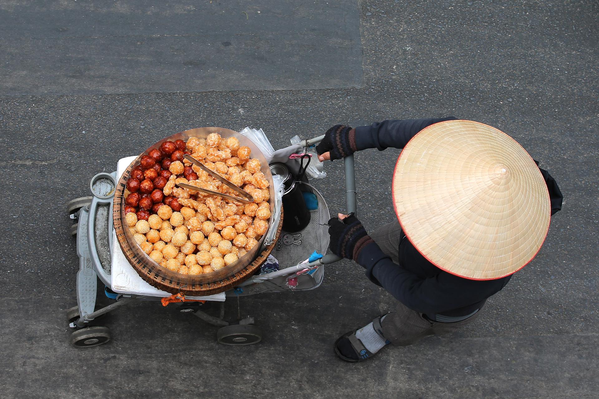 Vietnam, 12 de octubre de 2023. Una imagen compuesta de 9 fotografías muestra a vendedores ambulantes transportando sus diversos productos en las calles de Hanoi.