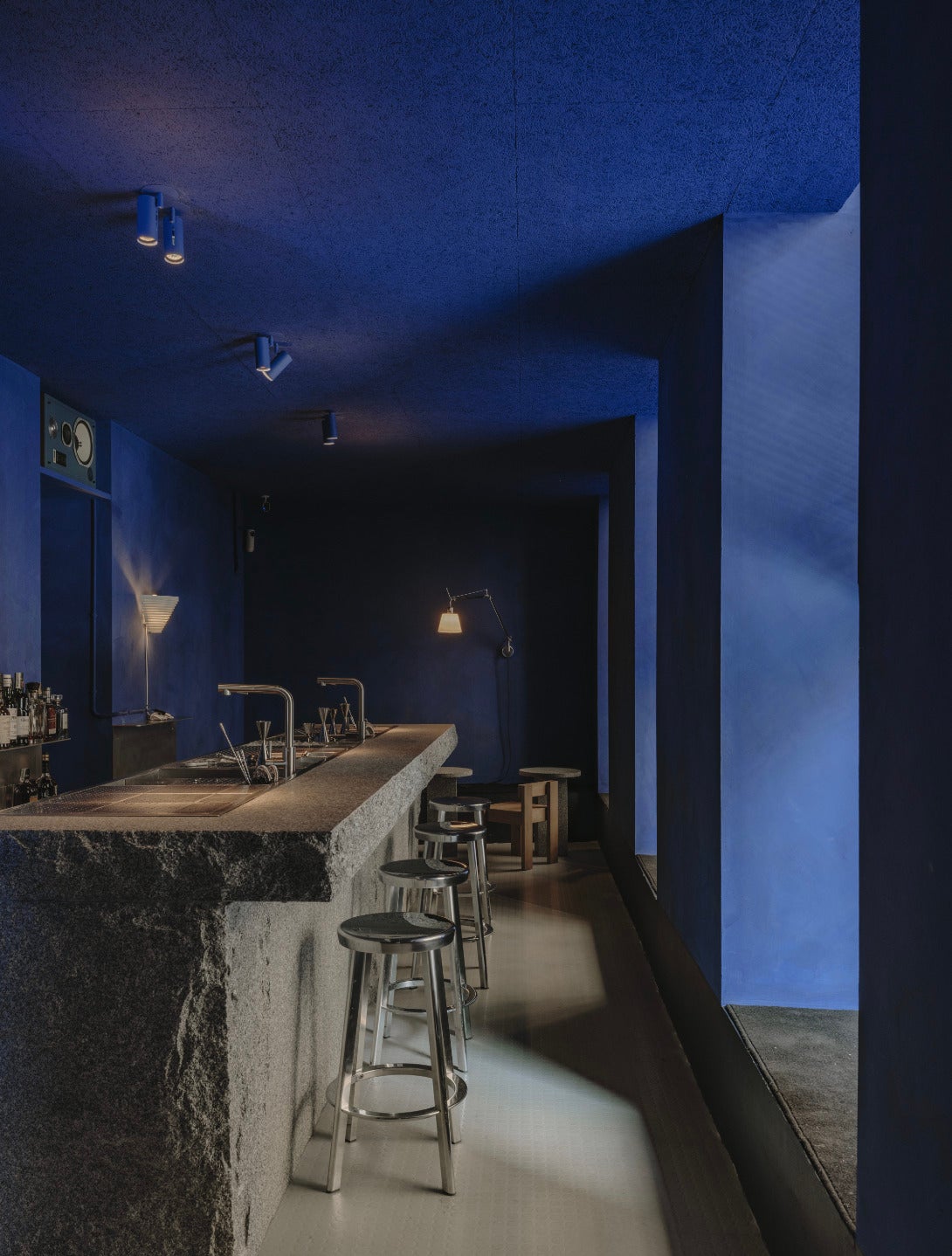 Su propuesta de drinks, music & thrills, tiene un adn que se siente desde el primer momento al cruzar la puerta en la calle Conde Duque 14. Un azul oscuro envolvente que tiñe todas las paredes del lugar, dan paso a casi que un “oasis nocturno bajo la luna”, con un toque clandestino y acogedor, en donde la música en vinilos, los cocteles experimentales y una carta con bocados exquisitos, se encuentran para ofrecer una experiencia sensorial a sus visitantes.
