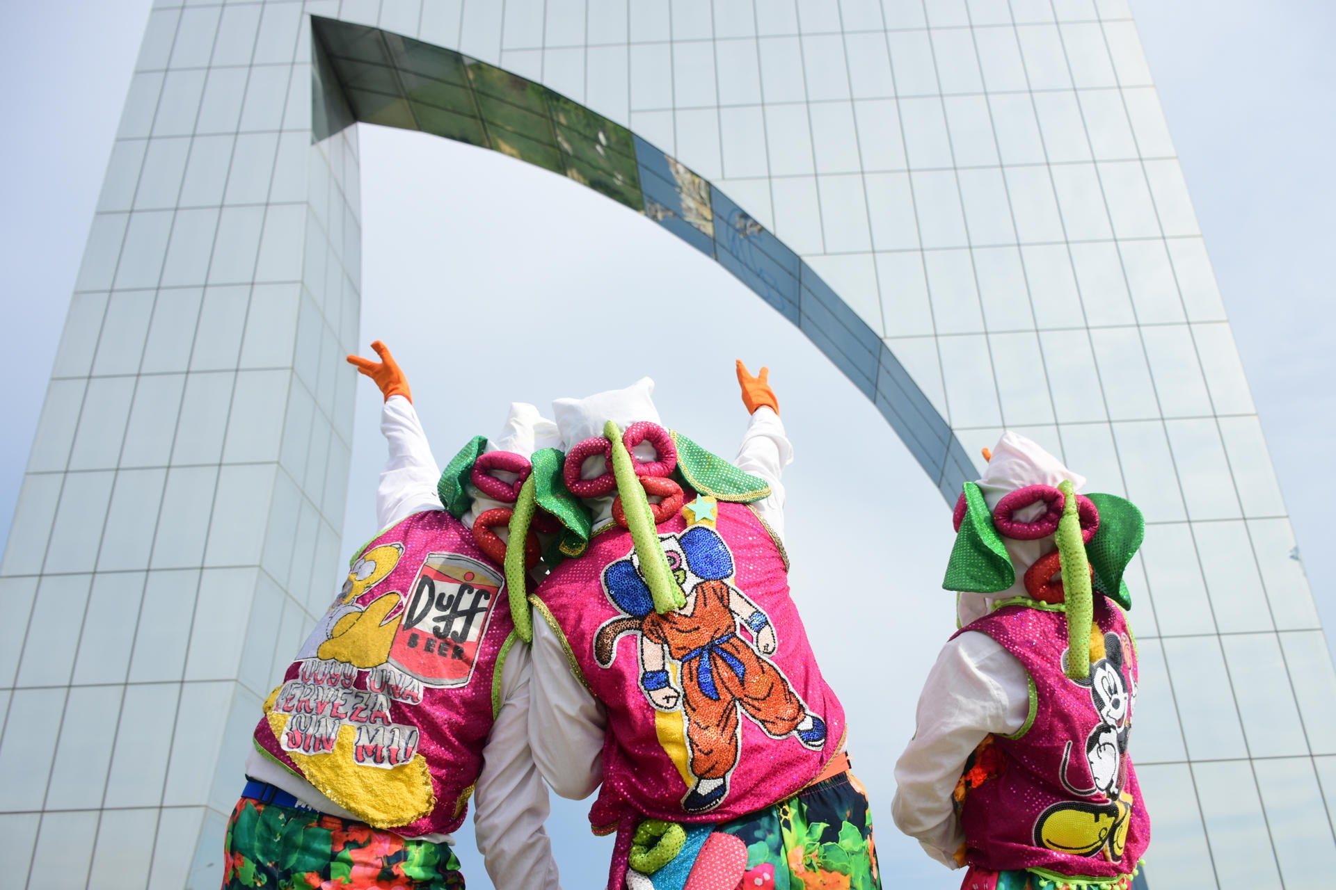 Integrantes de la comparsa 'Marimondas del barrio Abajo Paragüita' se presentan durante la celebración de los 100 años del equipo colombiano Junior este miércoles, en Barranquilla (Colombia).