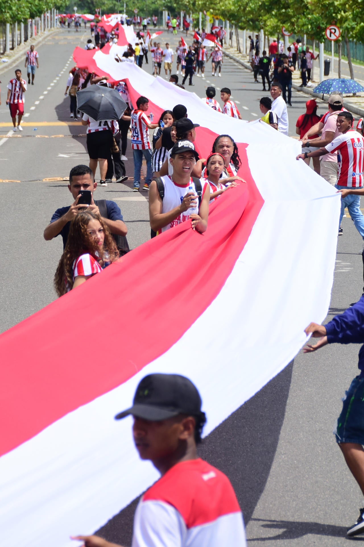 AMDEP4338. BARRANQUILLA (COLOMBIA), 07/08/2024.- Hinchas del equipo colombiano Junior extienden una bandera durante la celebración de los 100 años del club este miércoles, en Barranquilla (Colombia). Los hinchas del Junior de Barranquilla, uno de los grandes clubes del fútbol colombiano y el más popular de la región caribeña, celebraron este miércoles el centenario del equipo ondeando la bandera más grande del mundo. EFE/ Aleidys Coll