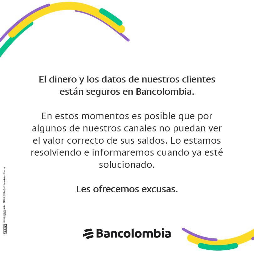 Bancolombia ha reconocido la existencia del problema y está trabajando en su solución. "Lo estamos resolviendo e informaremos cuando ya esté solucionado. Les ofrecemos excusas", declaró la entidad. Mientras tanto, los clientes enfrentan dificultades para realizar pagos y transacciones bancarias a través de la aplicación del banco.