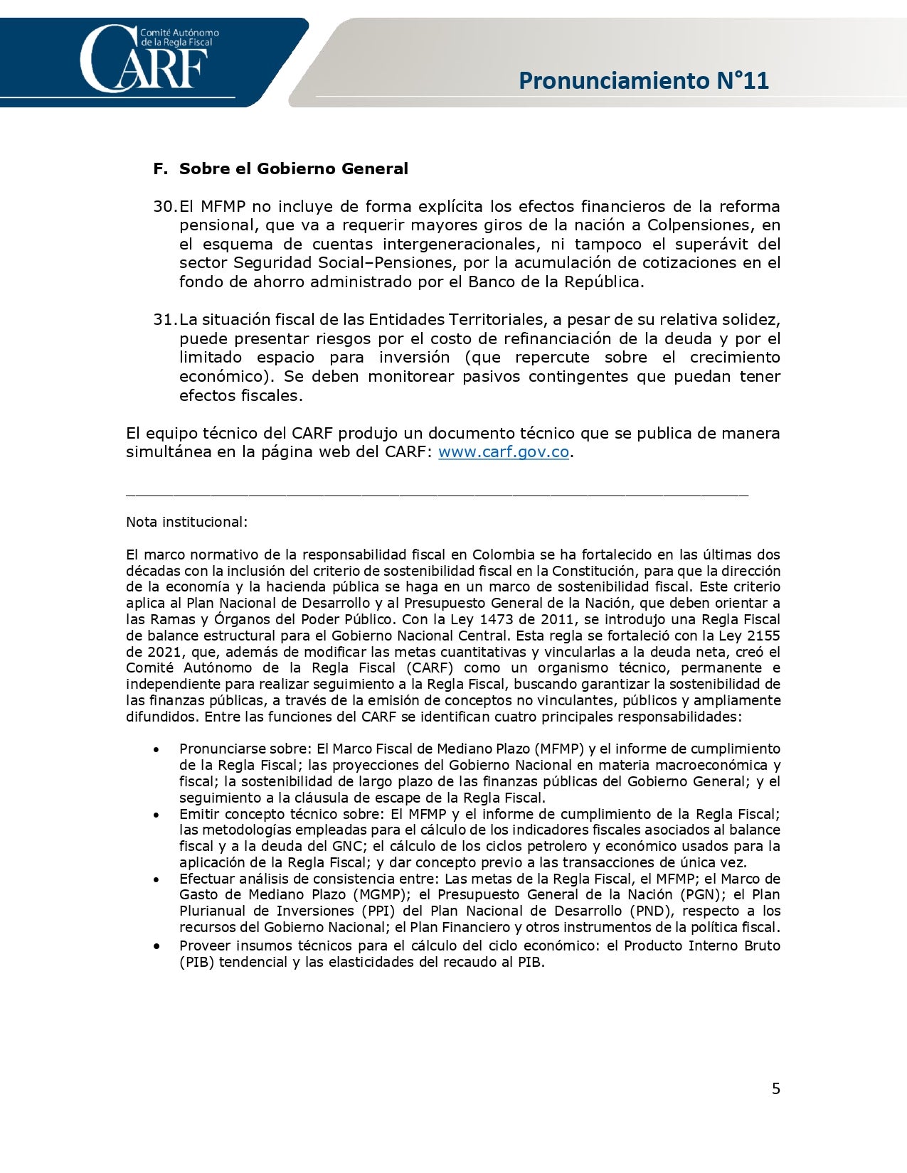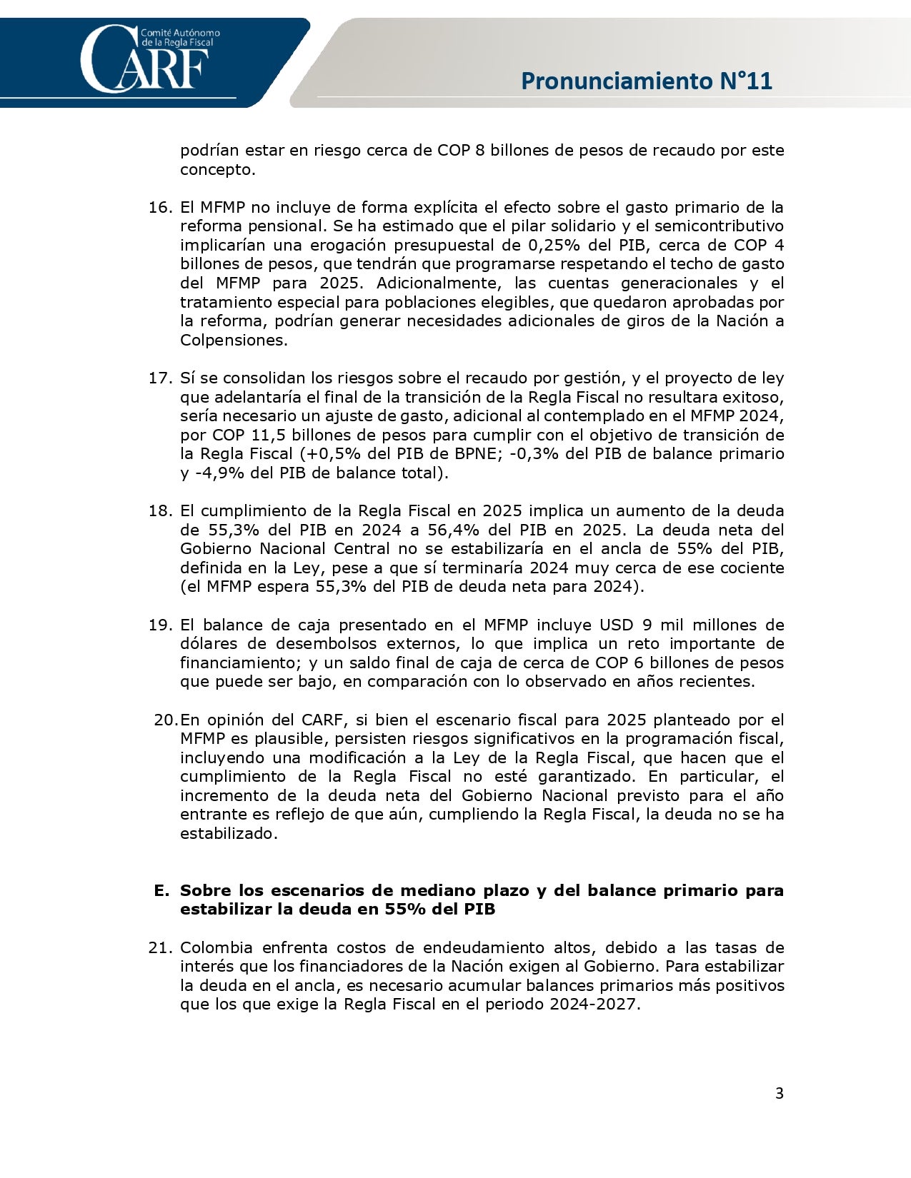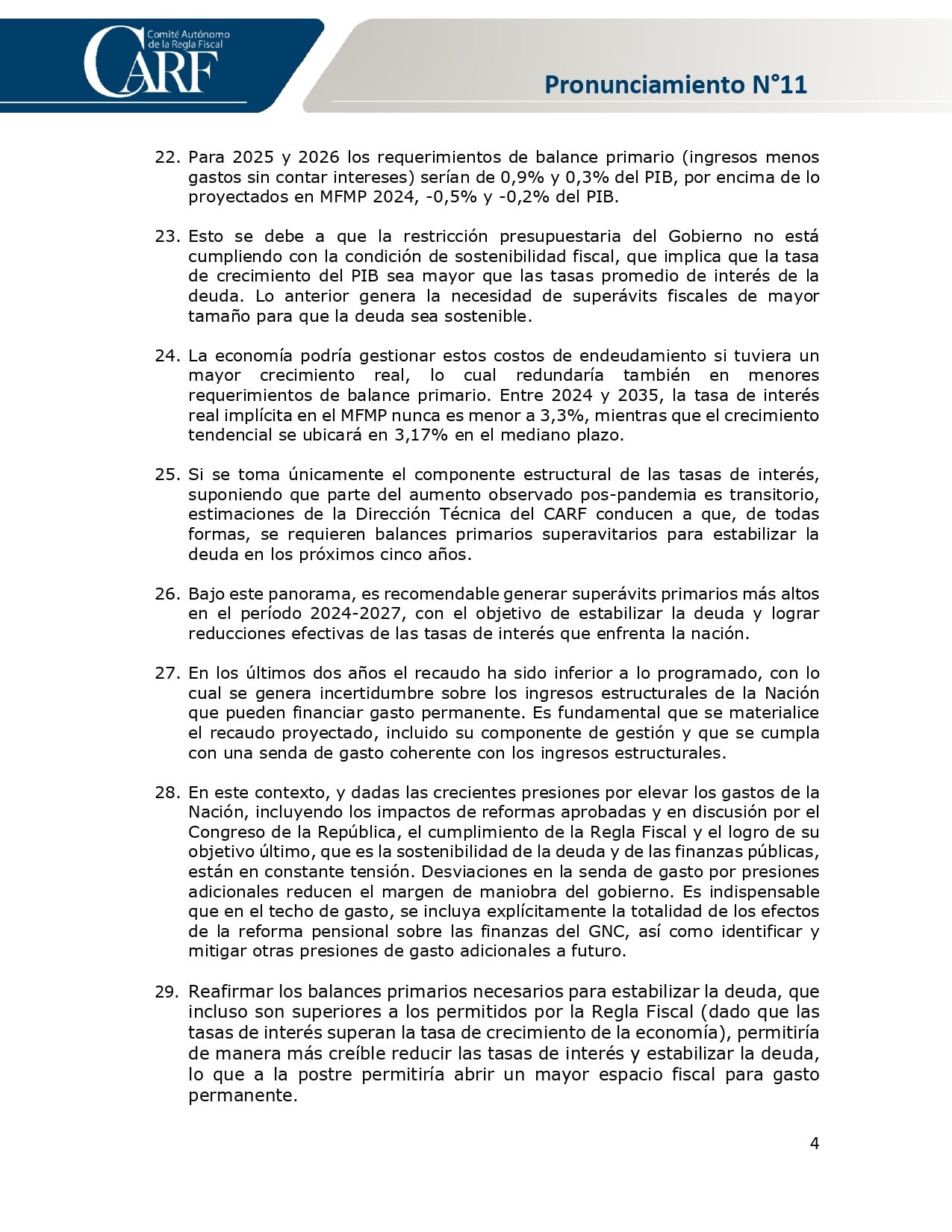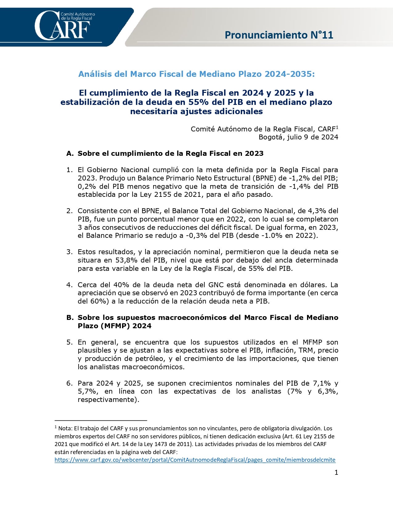 "El cumplimiento de la regla fiscal en 2024 dependerá de la consolidación de estas reducciones de gasto según lo indicado en el Marco Fiscal de Mediano Plazo, así como de ajustes fiscales adicionales en caso de que los riesgos afecten los ingresos estructurales del Gobierno", detalló el CARF en un comunicado.