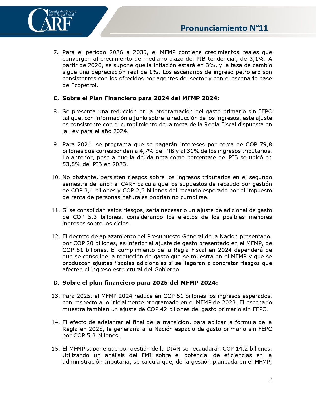 Sin embargo, el CARF destacó la persistencia de riesgos en los ingresos tributarios durante el segundo semestre del año, lo que podría requerir ajustes adicionales en el gasto por aproximadamente 5,3 billones de pesos (1.307 millones de dólares).