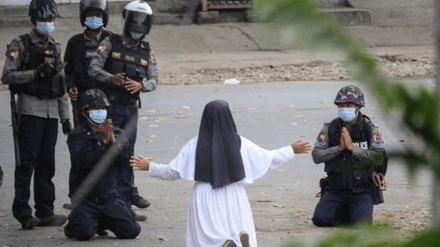 Ann Rose Nu Twang, monja de Birmania, se arrodilló frente a los militares suplicando que no dispararan contra los niños y diciendo «Dispárame a mí, no a los niños».