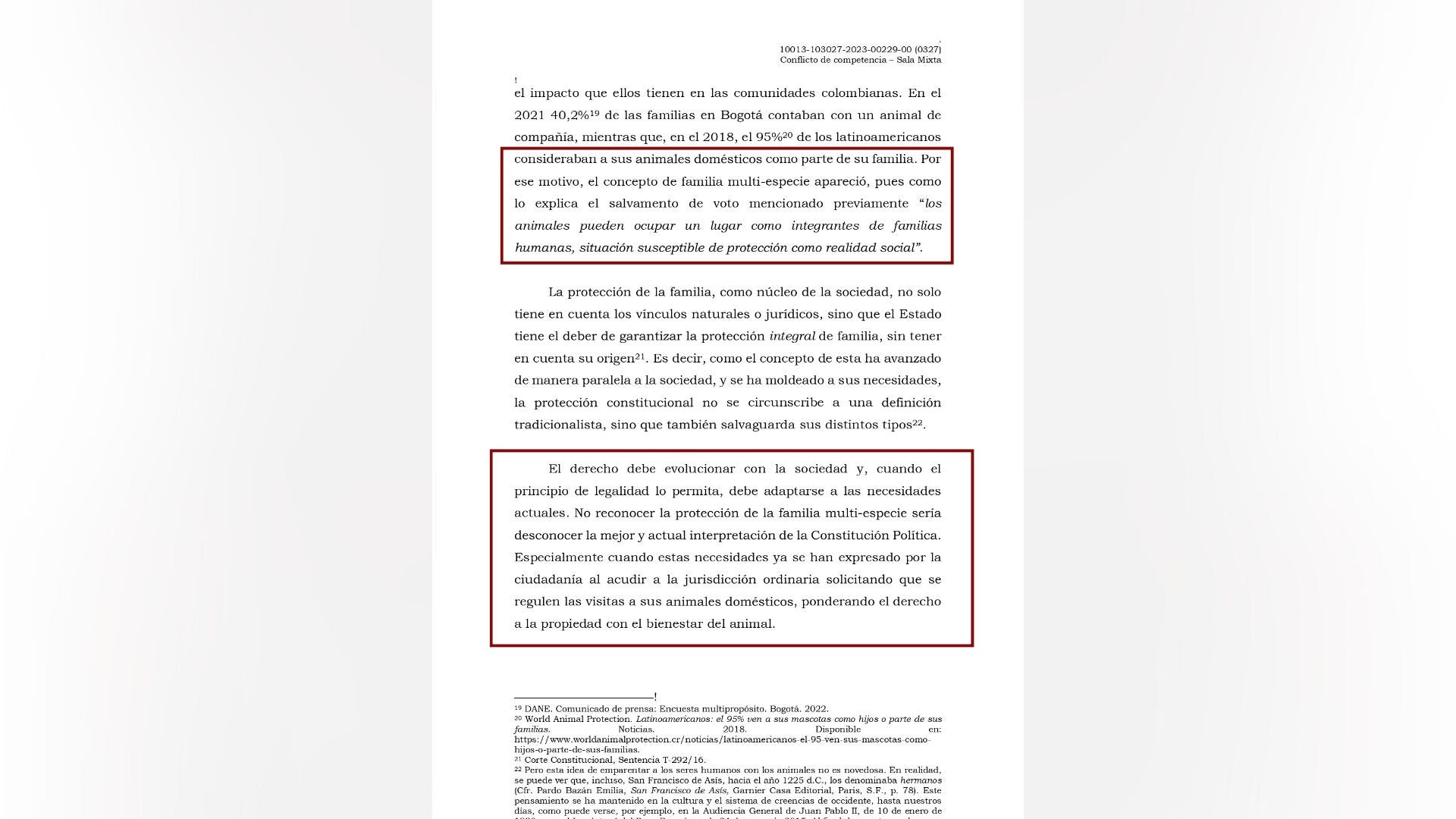 En esta decisión, el Tribunal Superior de Bogotá trata de dilucidar este conflicto de intereses y establece el "concepto de familia multiespecie", alegando que "los animales pueden ocupar un lugar como integrantes de familias humanas, situación susceptible de protección como realidad social".