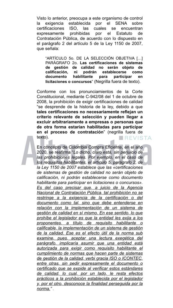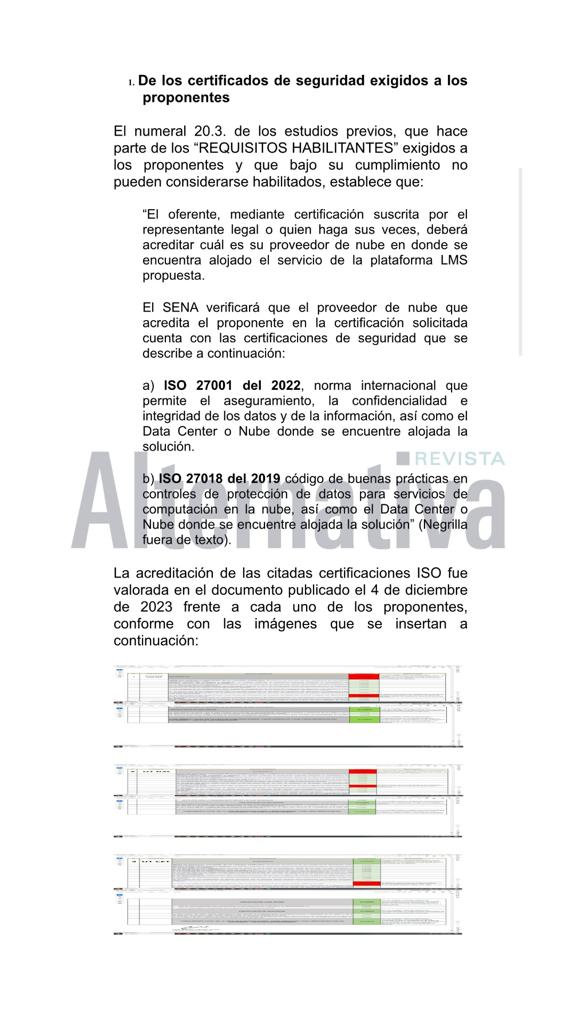 En el largo documento el ente de control, señala que el SENA verificará que el proveedor de nube que acredita el proponente en la certificación solicitada exige la certificación ISO 27001 de 2022 y la certificación ISO 27018 del 2019. “preocupa al organismo de control la exigencia establecida por el SENA sobre certificaciones ISO, las cuales se encuentran expresamente prohibidas por el Estatuto de Contratación Pública”.