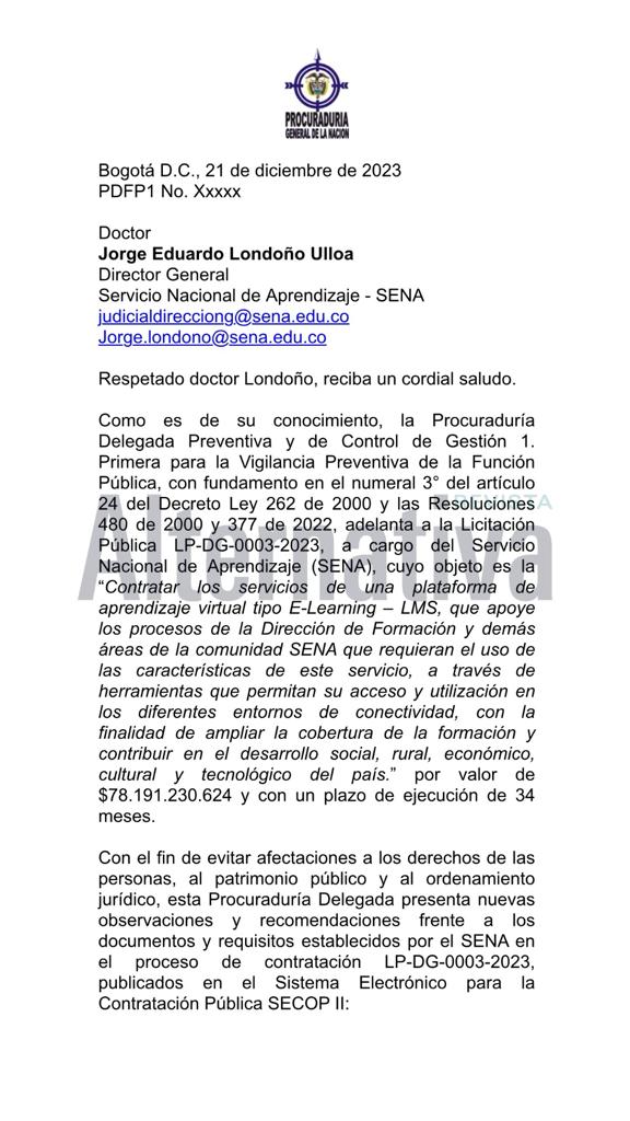En un fuerte pronunciamiento la Procuraduría Delegada para la Vigilancia Preventiva de la Función Pública, le pide al director del Sena, Jorge Eduardo Londoño, revocar la licitación relacionada con contratar los servicios de una plataforma de aprendizaje virtual tipo E- Learning- LMS, por 78 mil millones de pesos, que está programada para adjudicar en el día de mañana.
