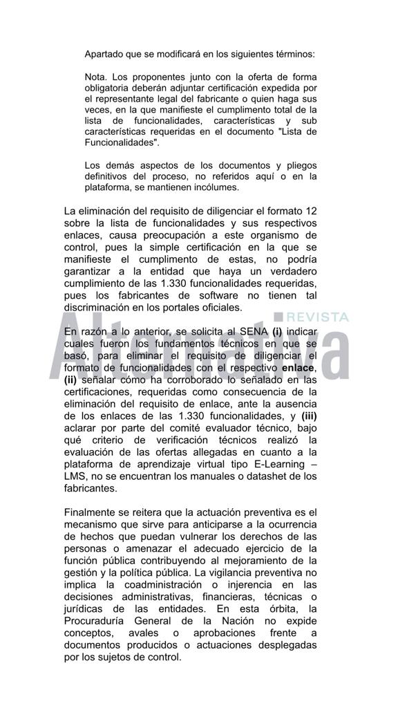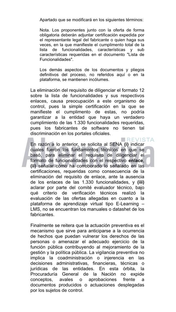 La Procuraduría Delegada para la Vigilancia de la Función Pública, también hace serios reparos a las funcionalidades del servicio. “El SENA exigió a los proponentes que junto con la oferta de forma obligatoria deberán diligenciar un formato de 12 Listas de Funcionalidades, con sus respectivos enlaces que permitan a la entidad la verificación del cumplimiento”.
