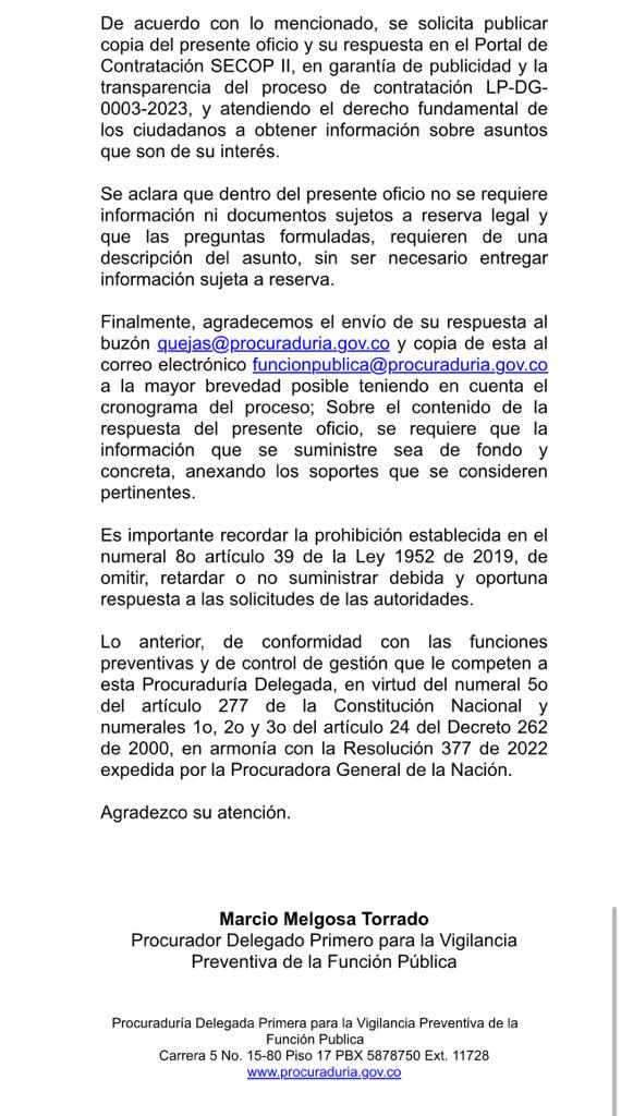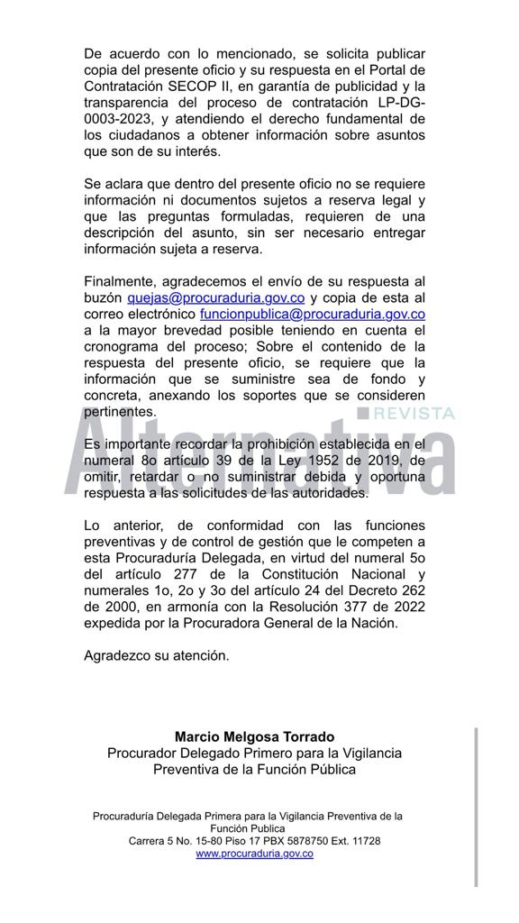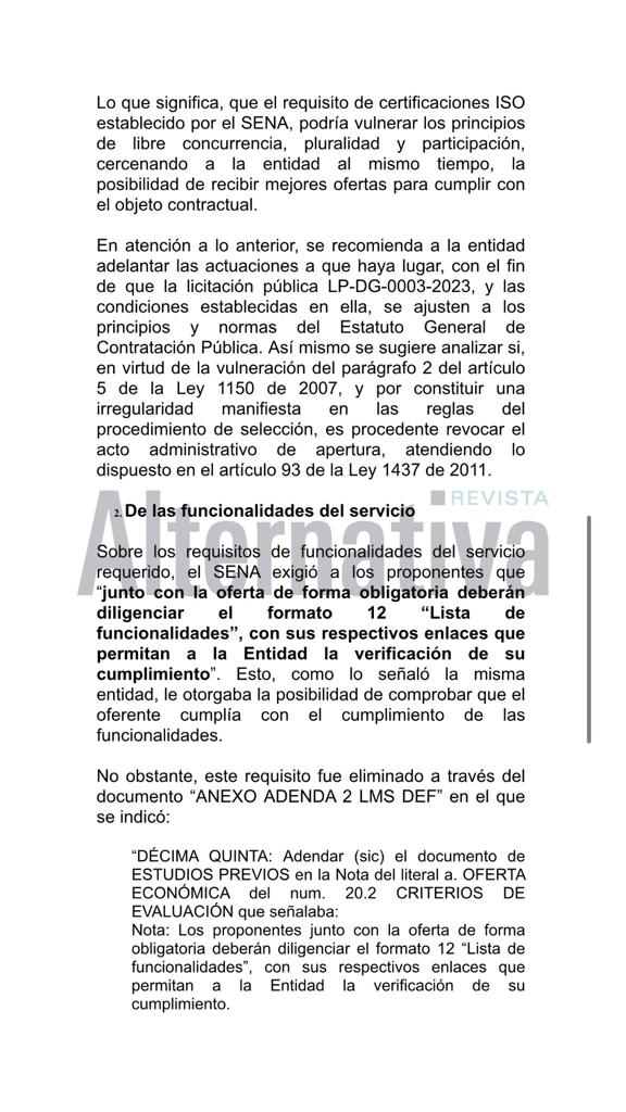 De acuerdo con el pronunciamiento de la procuraduría, en una carta dirigida a Londoño y que tiene en su poder la Revista Alternativa, esta solicitud se hace con el fin de “evitar afectaciones a los derechos de las personas, el patrimonio público y el ordenamiento jurídico”. Y agrega que la Procuraduría tiene nuevas observaciones y recomendaciones frente al proceso licitatorio convocado por el SENA.